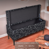 Каркас выполнен из берёзовой фанеры, которая придает прочность, но при этом не утяжеляет пуф, как в случае с МДФ. Он легко выдерживает нагрузку до 200 кг, а вес вложения может достигать 30 кг. Внутри ящика имеется лифт, который удерживает крышку в поднятом положении, когда это необходимо. Поролон высокого качества – не деформируется и не проседает по истечении времени.